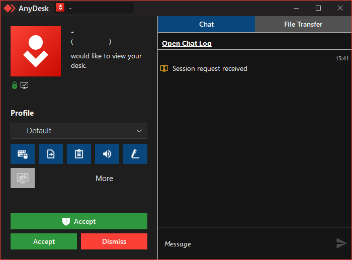 ▪A new message window opens that reads: 'Session request received. () would like to view your desk'.